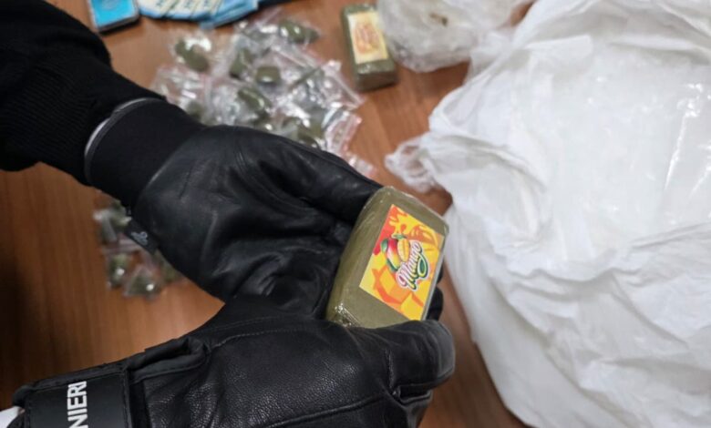 Sequestrati 67 grammi di eroina ancora da confezionare, 2 panetti di hashish per un peso complessivo di 203 grammi, 49 dosi di marijuana per un totale di 47,8 grammi e 20 dosi di hashish per un peso di 69 grammi.