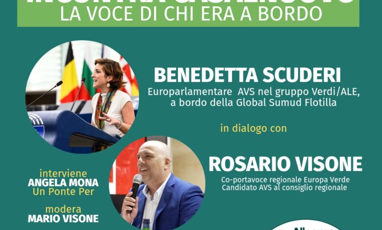 Rappresentante dei Verdi Europei a bordo della Global Sumud Flotilla, Benedetta Scuderi dialogherà con Rosario Visone, portavoce regionale campano di Europa Verde, per ripercorrere la missione umanitaria e riflettere sul significato della solidarietà internazionale.