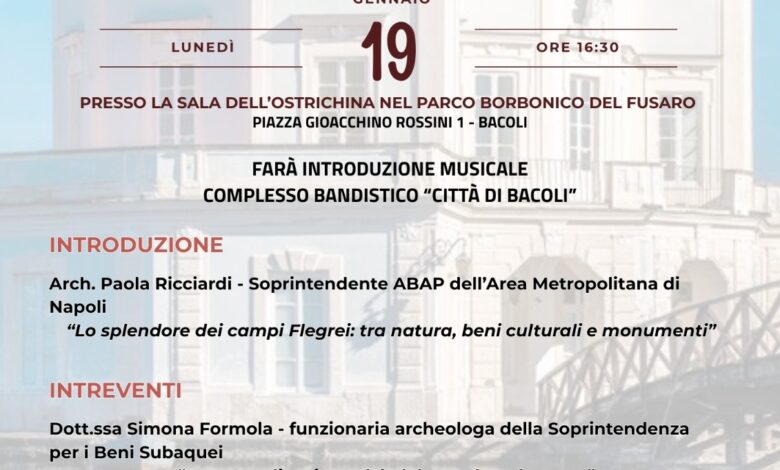 La seconda iniziativa si tiene lunedì 19 gennaio, alle ore 16:30, presso la Sala “Giuseppe Scotto di Luzio” del Palazzo dell’Ostrichina con un convegno a cui parteciperà anche la Soprintendenza Archeologia, Beni Culturali e Paesaggio dell’Area Metropolitana di Napoli.
