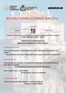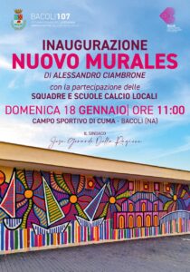 La prima si tiene domenica 18 gennaio, alle ore 11:00, presso il campo sportivo di Cuma con l’inaugurazione del murales realizzato dall’artista Alessandro Ciambrone. Un’opera ricca di significato, a sostegno della candidatura di Bacoli a Capitale Italiana della Cultura per il 2028 e che vuole essere un omaggio anche agli sport acquatici, con il richiamo alla Casina Vanvitelliana ed in prospettiva America’s Cup 2027 che coinvolgerà tutto il golfo di Napoli. L’artista Alessandro Ciambrone ha da poco ottenuto il premio da Guinness World Record, per aver realizzato sulla facciata della Casa Circondariale di Santa Maria Capua Vetere il murales più grande del mondo. Bacoli può già vantare tante sue realizzazioni tra gli ex spogliatoi che affacciano sul Lago Maremorto e l’ex Caffé Letterario nel quartiere di Cento Camerelle.