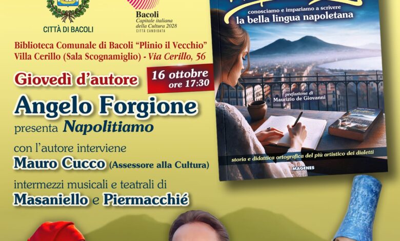 Giovedì 16 ottobre 2025, alle ore 17:30, presso la Sala Eduardo Scognamiglio di Villa Cerillo, ci sarà la presentazione del nuovo libro “Napolitiamo – cominciamo e impariamo a scrivere la bella lingua napoletana” del giornalista, scrittore e “napoletanista” Angelo Forgione. Ospiti il caratterista Piermacchié e il cantante e musicista Masaniello.