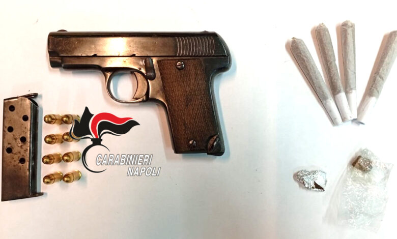 In auto due dosi di hashish e 4 spinelli. Un bottino che stonava con la visibile agitazione dell’uomo. Approfondita la perquisizione, i militari hanno trovato una pistola semiautomatica calibro 7,65 nel vano motore. L’arma, senza matricola e marchio, era carica di 6 proiettili. Con la pistola anche ulteriori due munizioni.