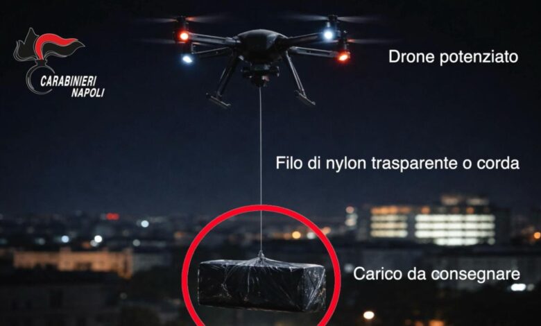 Un drone con un filo di nylon al quale era legata una busta. Dentro 3 smartphone, 200 grammi di hashish e circa 4 di crack. È l’ultima spedizione finita fuori rotta, in strada e poi nelle mani nei Carabinieri piuttosto che in quelle di detenuti del carcere di Poggioreale.