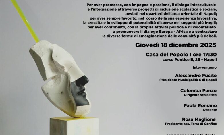 La cerimonia di consegna del Premio Ponticelli avverrà giovedì 18 dicembre 2025 alle 17:30 alla Casa del Popolo (corso Ponticelli 26). Intervengono Alessandro Fucito, presidente VI Municipalità di Napoli; la dirigente scolastica Colomba Punzo e la docente Paola Romano insieme a Rosa Maglione, presidente associazione TerradiConfine. L’evento sarà moderato da Imma Colonna, vicepresidente di Arci Movie.