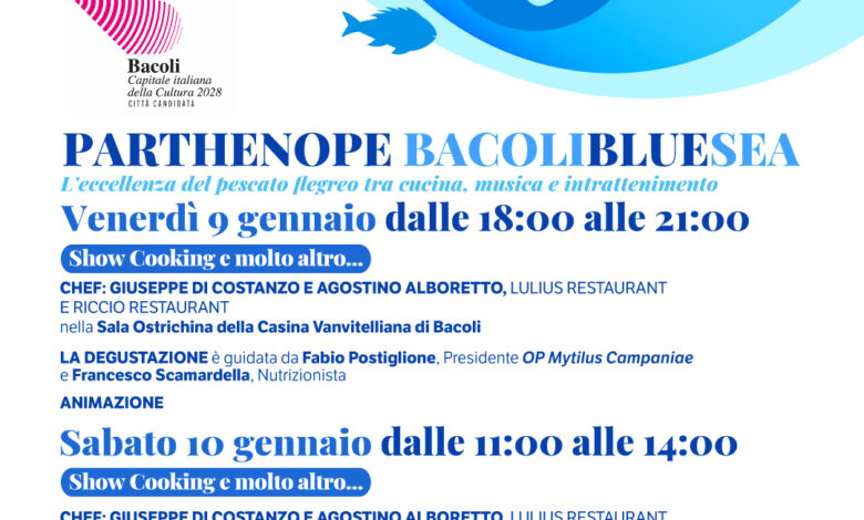 Venerdì 9 e sabato 10 gennaio, la Casina Vanvitelliana di Bacoli ospita Parthenope Bacoli Blue Sea, evento dedicato alla valorizzazione della cucina flegrea e delle eccellenze del mare, con particolare riferimento al pescato stagionale e alla cozza. L’iniziativa, organizzata dal GAL Parthenope, si inserisce nel percorso di promozione del patrimonio culturale e identitario del territorio e sostiene la candidatura della Città di Bacoli a Capitale Italiana della Cultura 2028, attraverso un format che unisce gastronomia, cultura e divulgazione. Cuore dell’evento saranno due show cooking, uno per ciascuna giornata, in programma nella Sala Ostrichina. Gli appuntamenti saranno curati dagli chef Giuseppe Di Costanzo e Agostino Alboretto, dei ristoranti Lulius Ristorante e Riccio Restaurant.