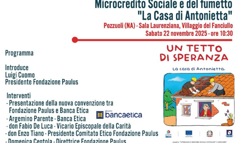 Sabato 22 novembre 2025 alle ore 10:30, presso la Sala Laurenziana del Villaggio del Fanciullo (Via Campi Flegrei, Pozzuoli), la Fondazione Paulus presenterà ufficialmente la nuova convenzione siglata con Banca Etica per l’attivazione di un programma di microcredito sociale rivolto a famiglie e persone che attraversano momenti di difficoltà economica, ma che possono recuperare stabilità e autonomia attraverso un sostegno finanziario accompagnato e responsabile.